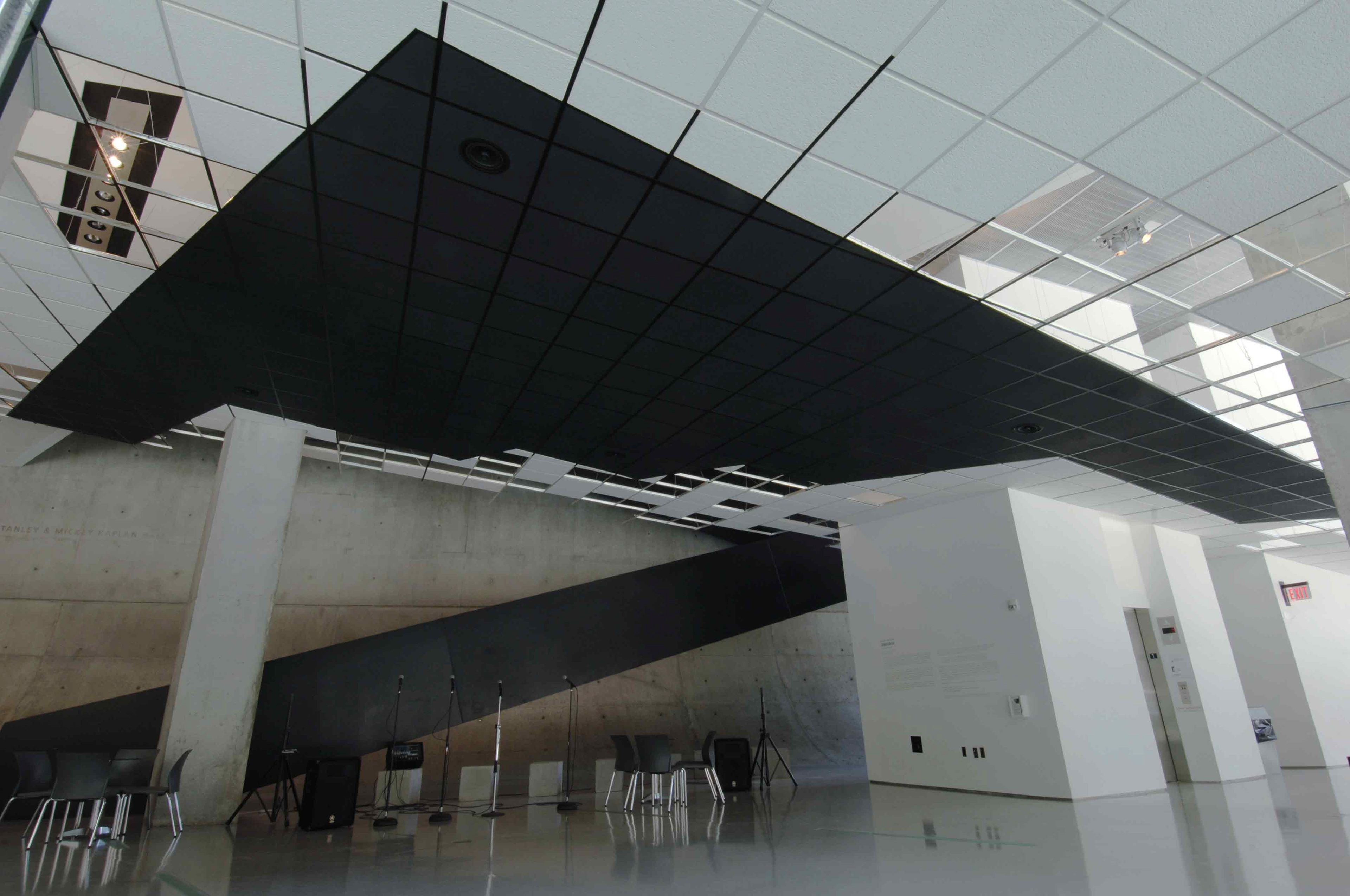 In the CAC, acoustic ceiling tiles, a mundane symbol of advanced building systems, were deployed in the shape of a B-2 stealth bomber, a symbol of advanced military weaponry and national pride. The imposing, suspended form, constructed of a ubiquitous office material calls into question the relationship between military-industrial and consumer product technologies. Gloom and Doom presents an architectural overlay that conceals the building’s structure while revealing the invisible barriers that alter perception of the built environment. The original aesthetic intent of the lobby space is violated even as it is improved acoustically.