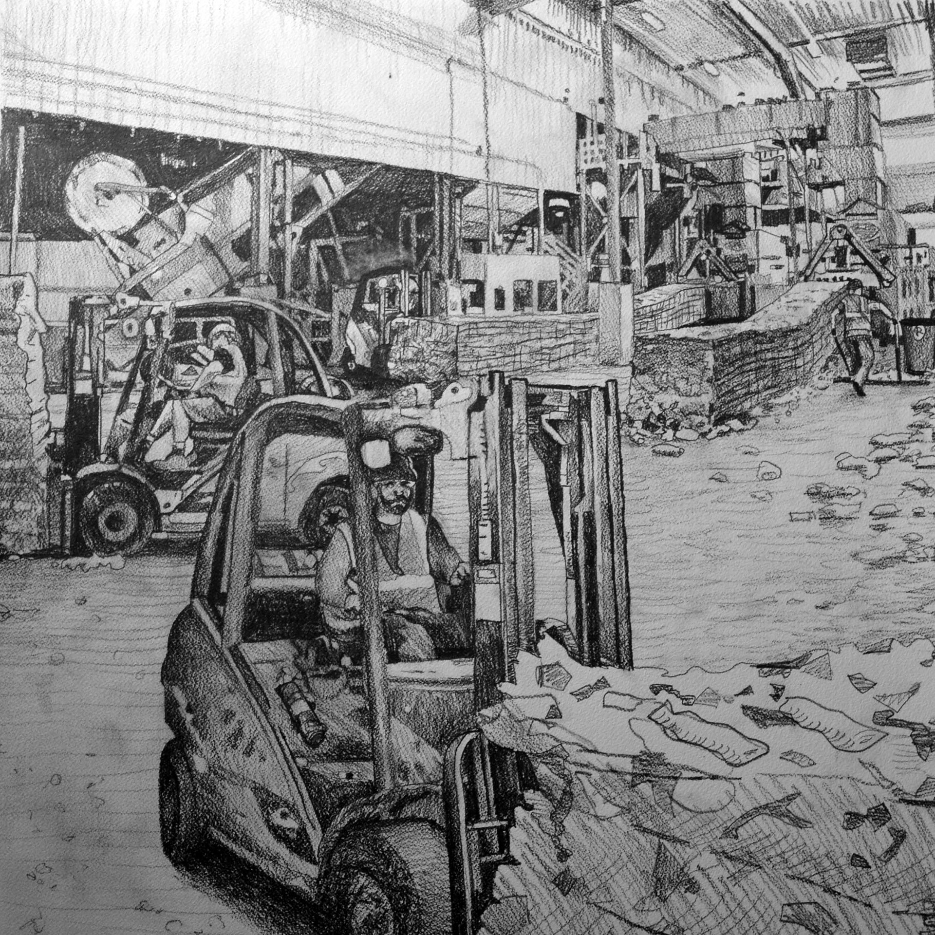 Featured in this mosaic is Rumpke Recycling’s $34 million St. Bernard/Elmwood Place facility, which reopened in 2013 after it was destroyed by a fire in April 2012. Depicted in the mosaic is the large bailer and shipping floor where a team of forklift operators maneuver elegantly and efficiently around each other as they load bails onto railroad shipping, mainly head-ed for Chinese factories. Pictured in the mosaic are Billy DeLaughter, Carroll Weider, David Oldigies, and Roy Fugate.