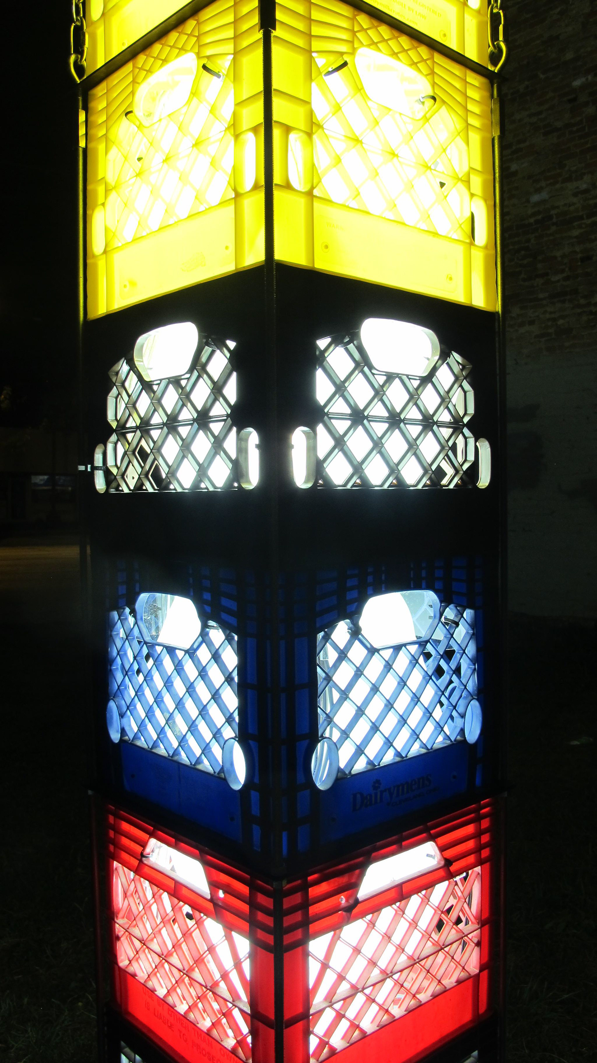 Endless Commerce is a towering stack of standard milk crates commissioned for Cincinnati’s popular BLINK festival in October 2017. The column pays homage to Brancusi’s iconic Endless Column with its translucent Mylar pyramids inside the crates. The tower is lit by 30 watt LED bulbs held within each crate and automated by an Arduino in the tower’s base. Endless Commerce addresses the seemingly endless supply of products and consumption with an appreciation of the individual participants in the global marketplace.