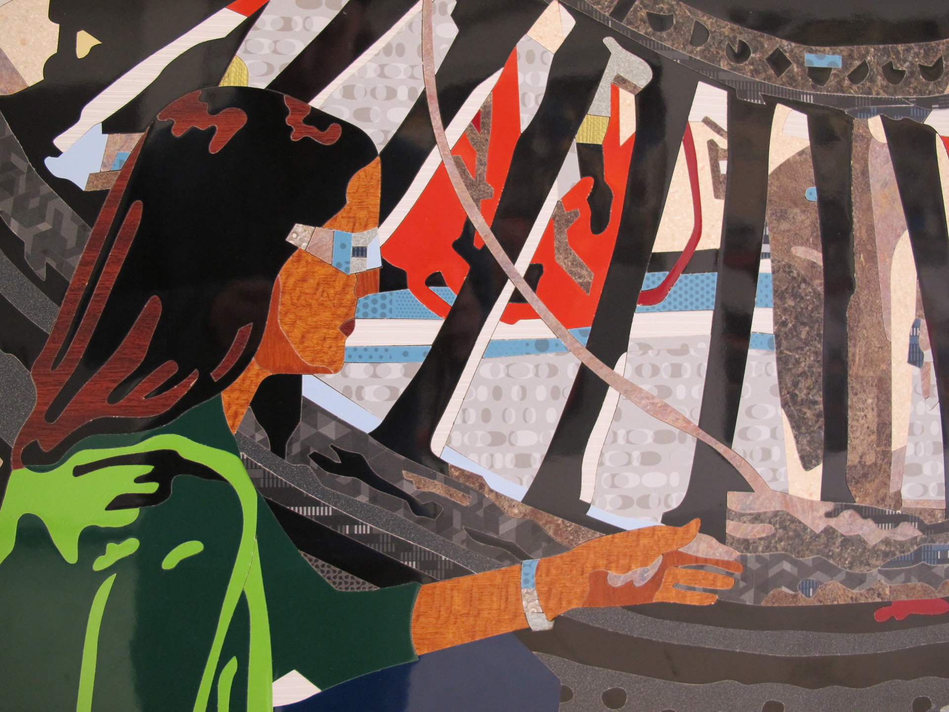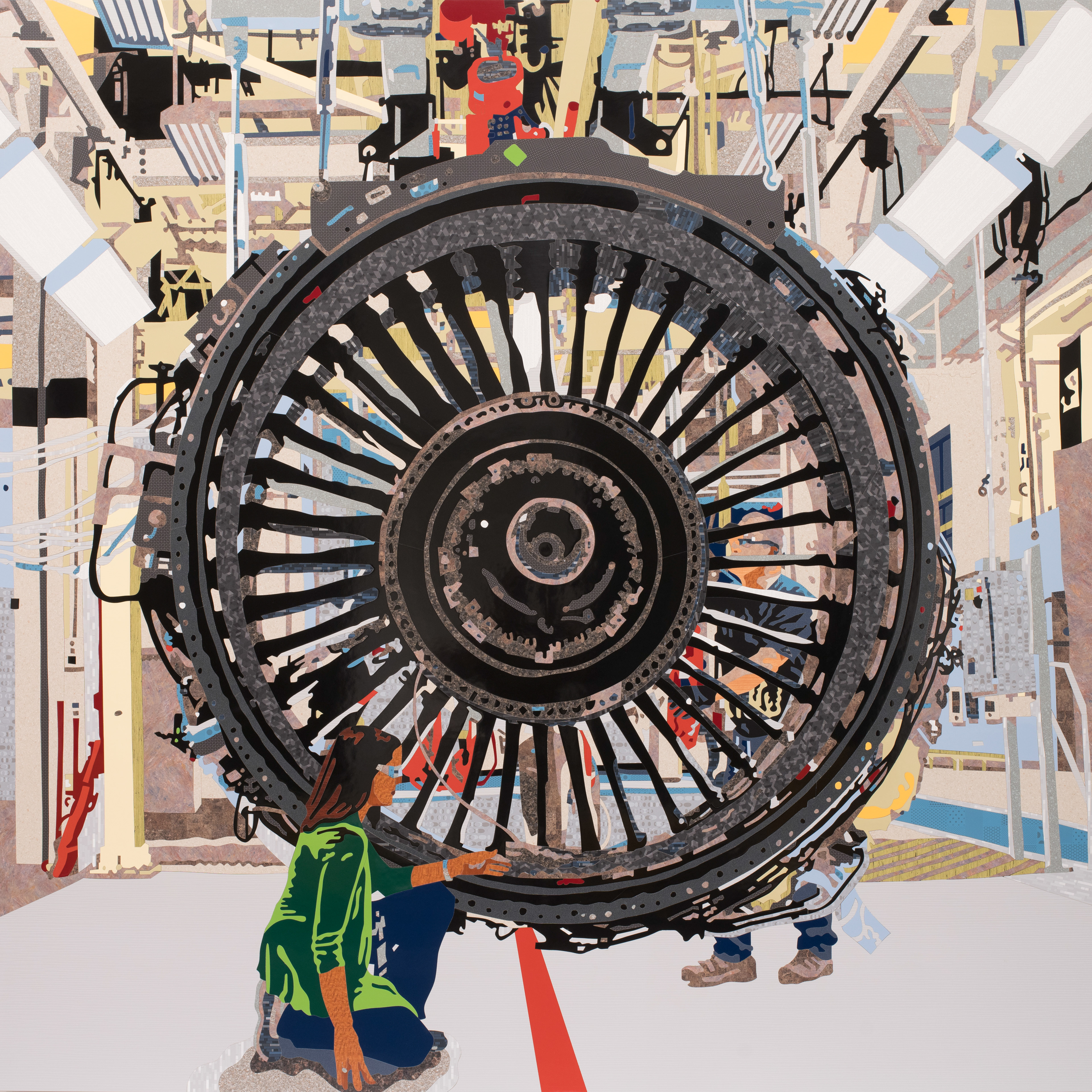 General Electric (GE) began in the 1940s what is today known as GE Aviation in Evendale. Its history is intertwined with the twentieth century’s most defining achievements and challenges. GE is one of the world’s largest corporations and produces a variety of engines for commercial aircraft at its Evendale facility. GE Aviation has manufacturing operations all over North America, and the Evendale plant conducts final assembly for engines produced by CFM International, a joint venture between GE Aviation and Safran Aircraft Engines of France.This mosaic was created after a visit to a research and development assembly line. The iconic form of the jet engine turbofan defines the composition as engineers Kelly Terborg, lead operations engineer, and Matt Barnes, assembly mechanic, analyze the manufacturing process. The highly technical nature of GE’s jet engine is reflected in this extremely detailed artwork.