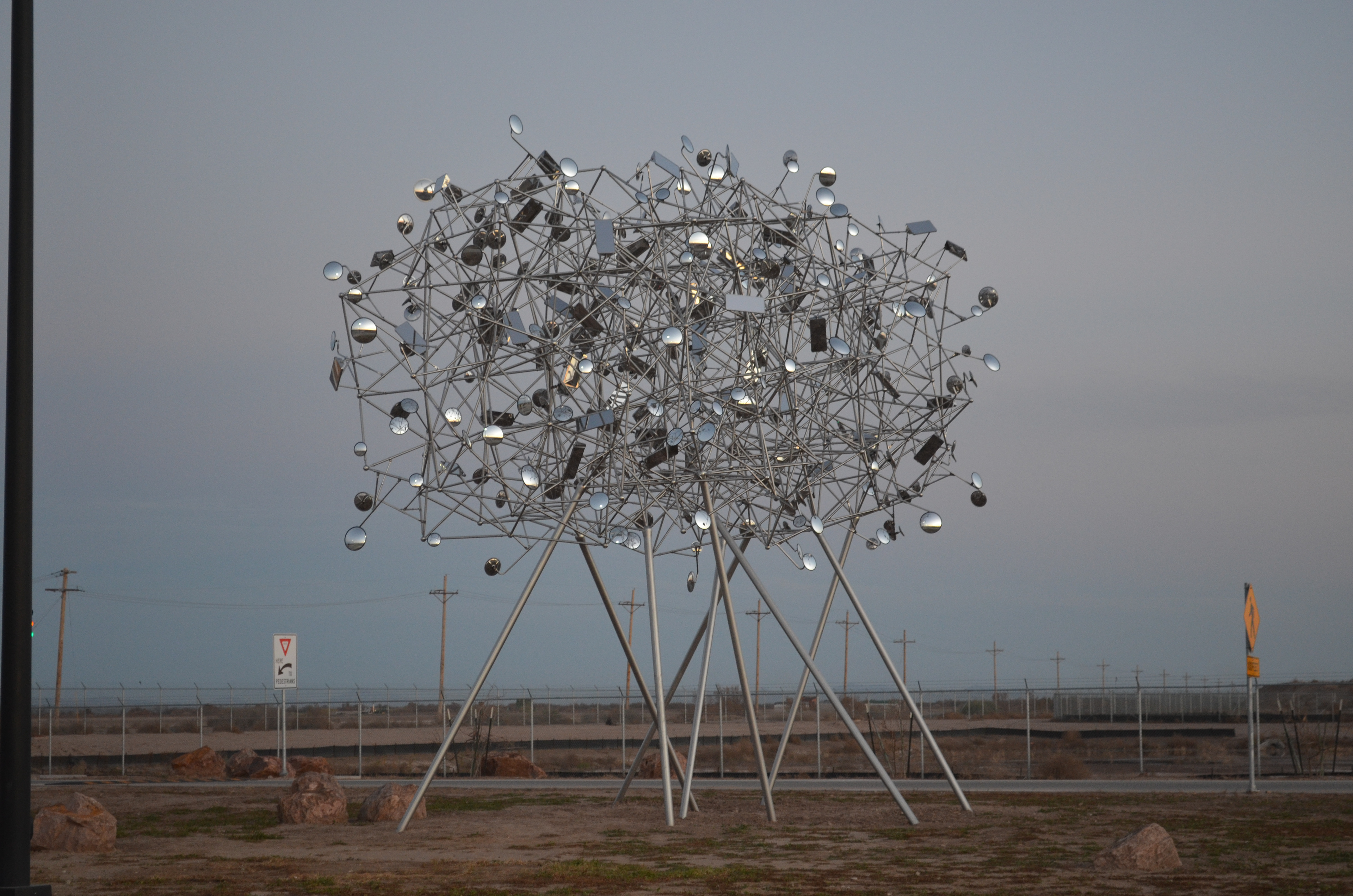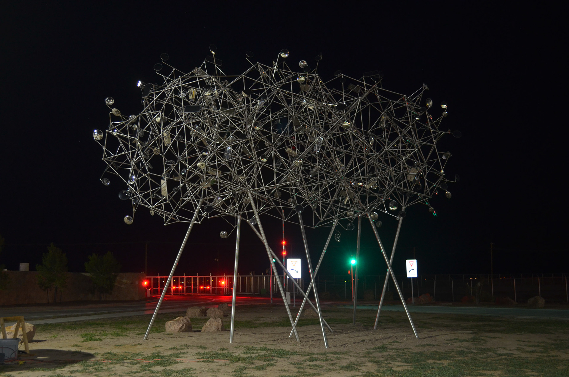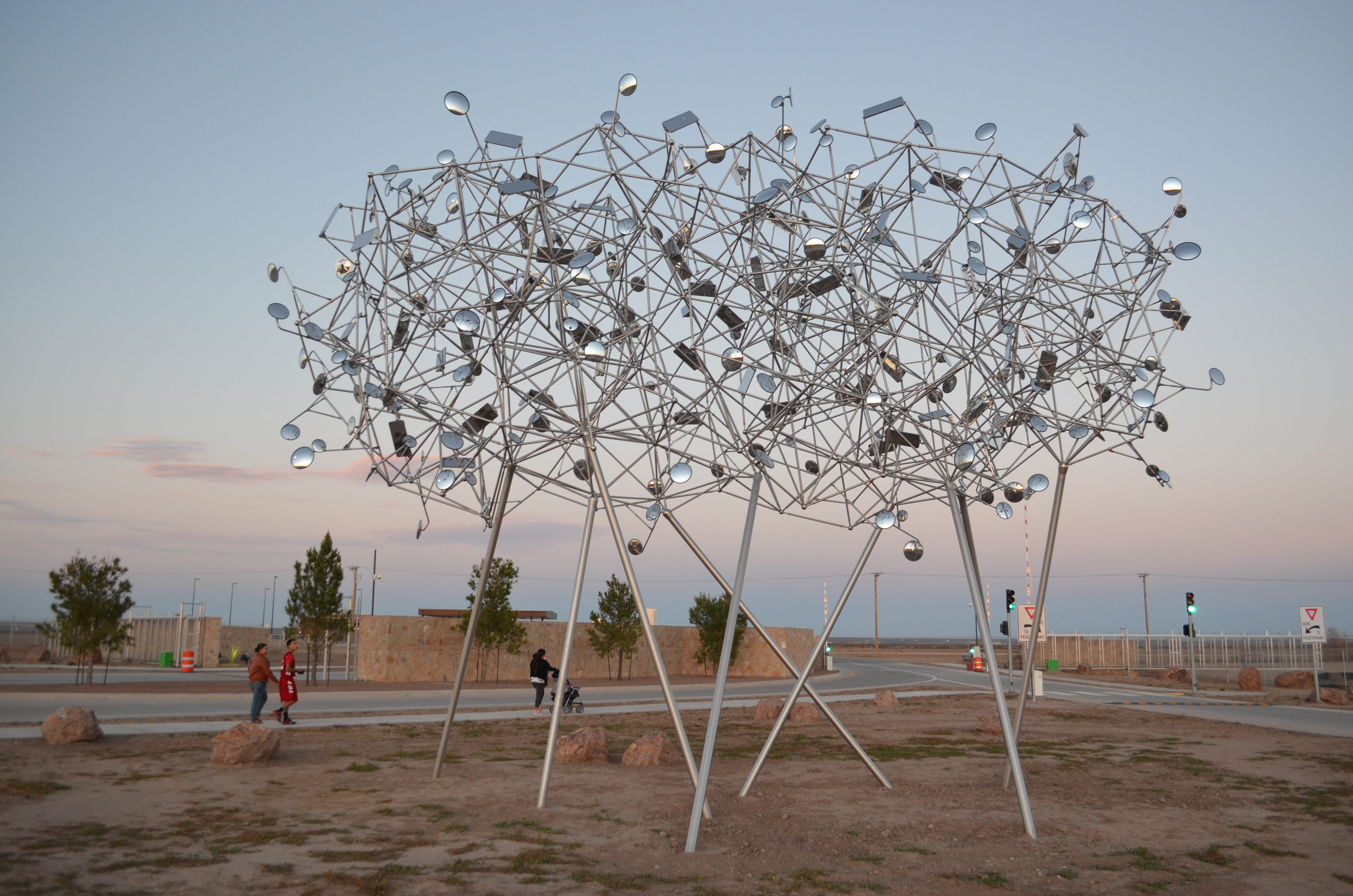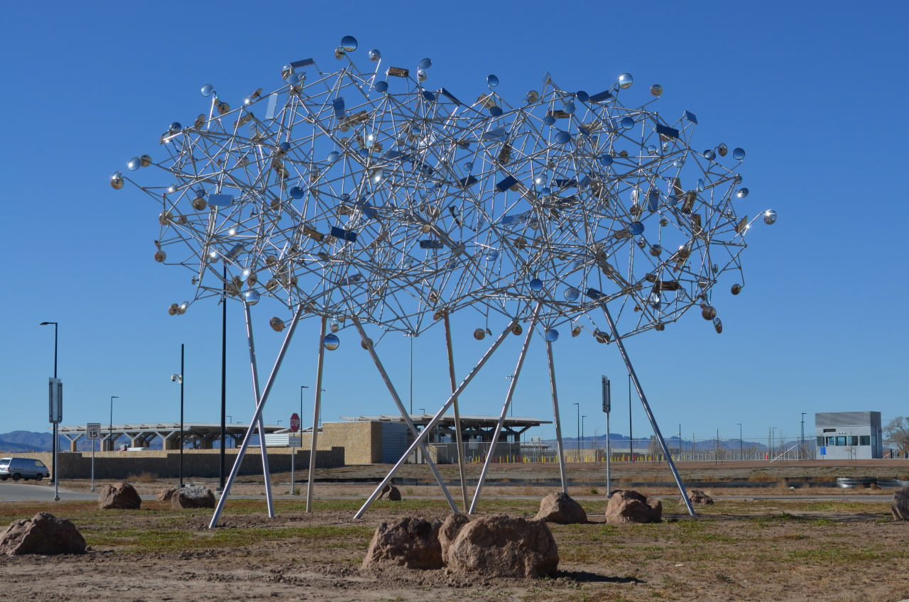 Taking inspiration from structures in biology and nature, Rodadora Frontera is a close-packed geometric lattice, further abstracted by the addition of common truck mirrors and their various armatures. The randomly placed mirrors gather light and reflect surroundings and sky, changing its appearance throughout the day. This ethereal form hovers within the fenced area of the U.S.-Mexico Tornillo border crossing, situated twenty miles southeast of El Paso/Juarez. U.S. Customs built the port to redirect the heavy truck traffic away from the city ports. Named after the common tumbleweed, an icon of desert plants known for their ability to disperse seeds far and wide. Border Tumbleweed is fixed, mid-flight, near the border fence, there to reflect and disperse the surrounding light.
