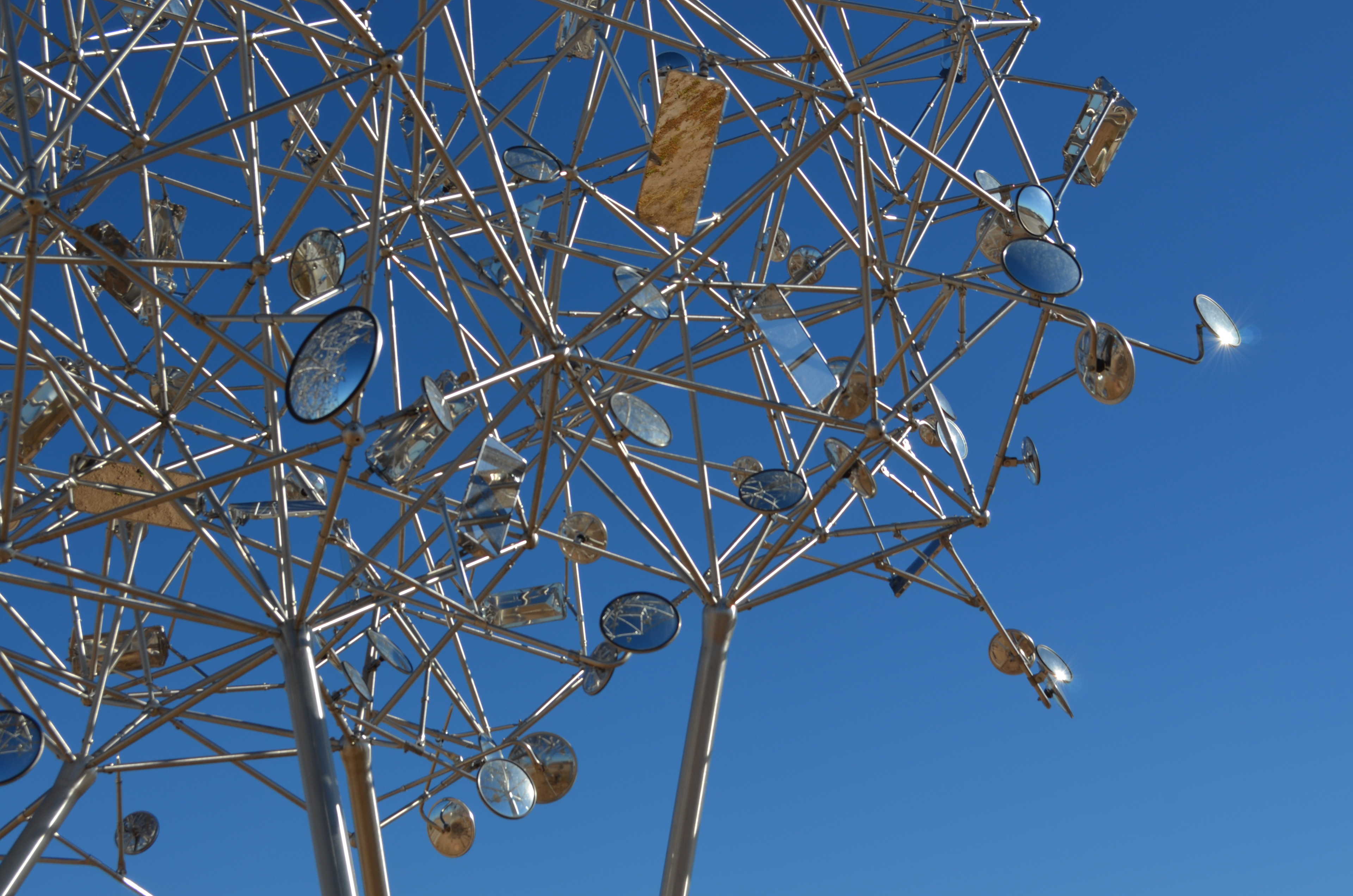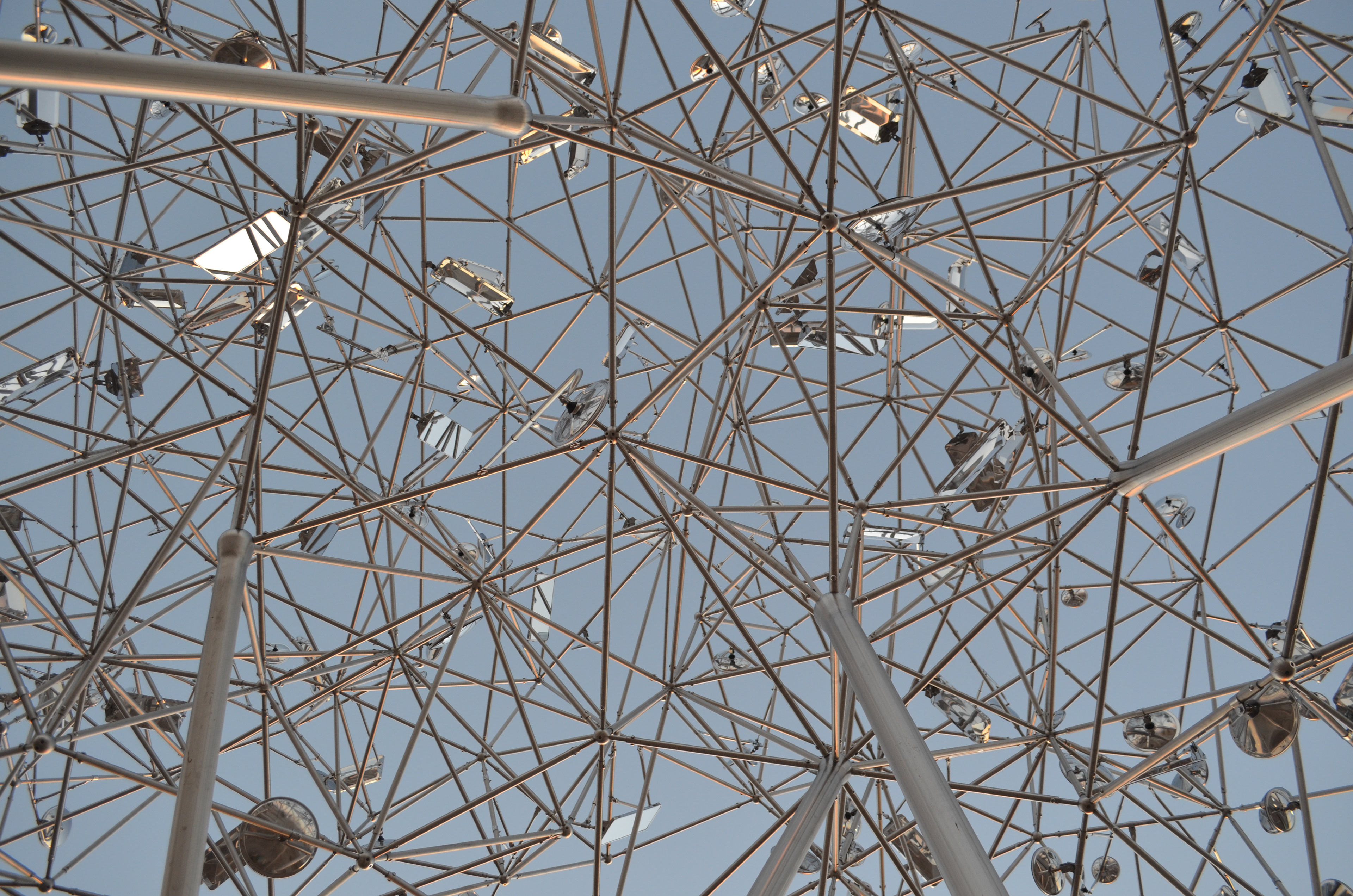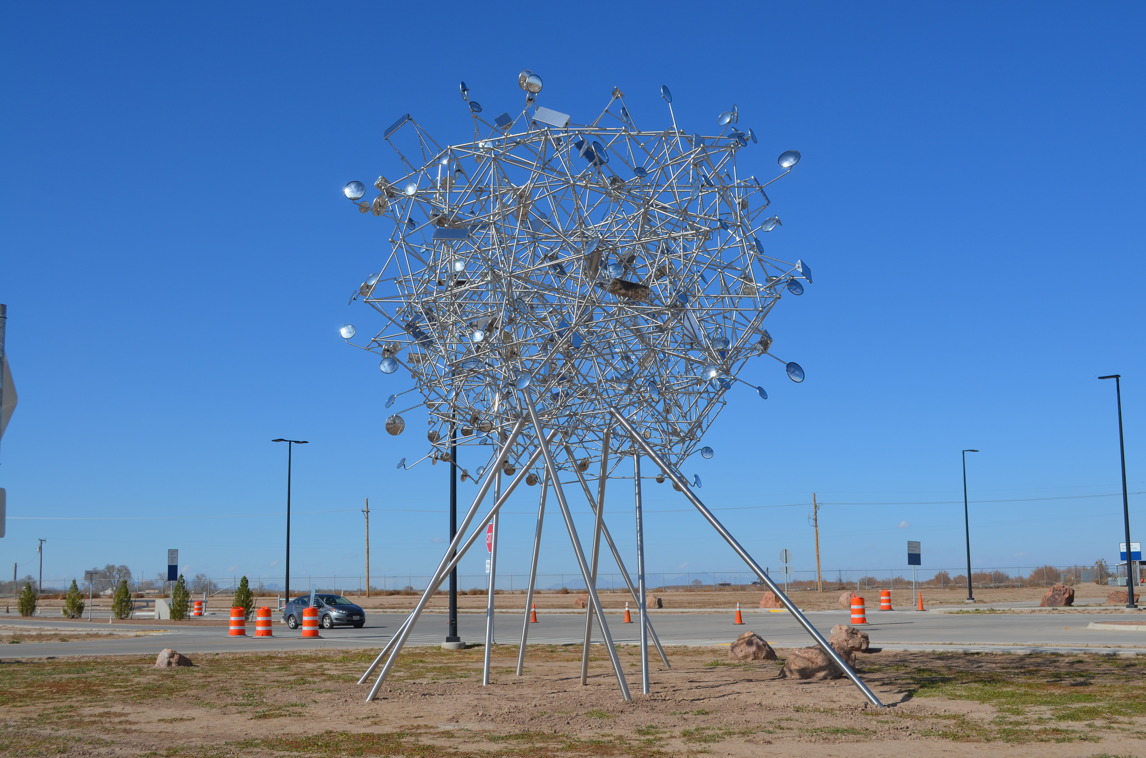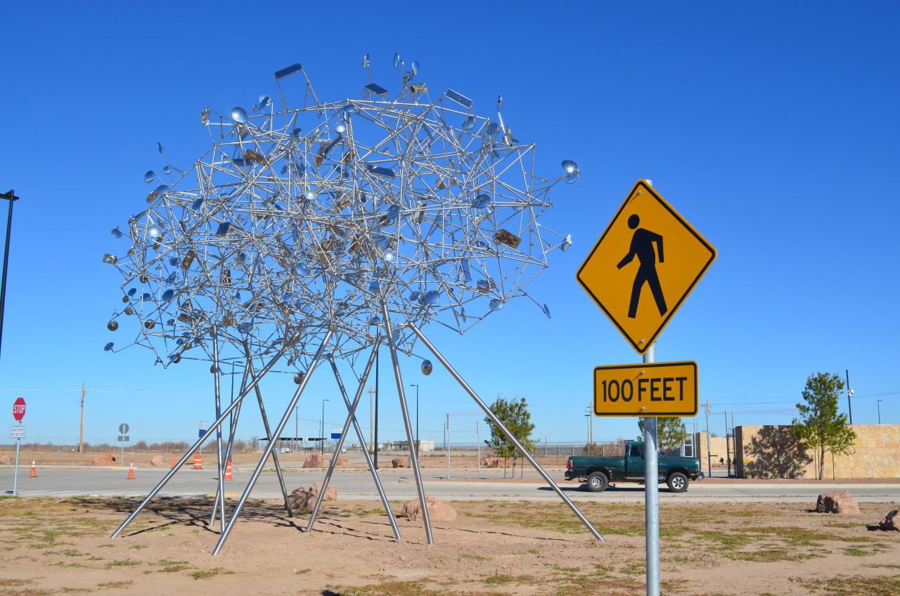 Taking inspiration from structures in biology and nature, Rodadora Frontera is a close-packed geometric lattice, further abstracted by the addition of common truck mirrors and their various armatures. The randomly placed mirrors gather light and reflect surroundings and sky, changing its appearance throughout the day. This ethereal form hovers within the fenced area of the U.S.-Mexico Tornillo border crossing, situated twenty miles southeast of El Paso/Juarez. U.S. Customs built the port to redirect the heavy truck traffic away from the city ports. Named after the common tumbleweed, an icon of desert plants known for their ability to disperse seeds far and wide. Border Tumbleweed is fixed, mid-flight, near the border fence, there to reflect and disperse the surrounding light.