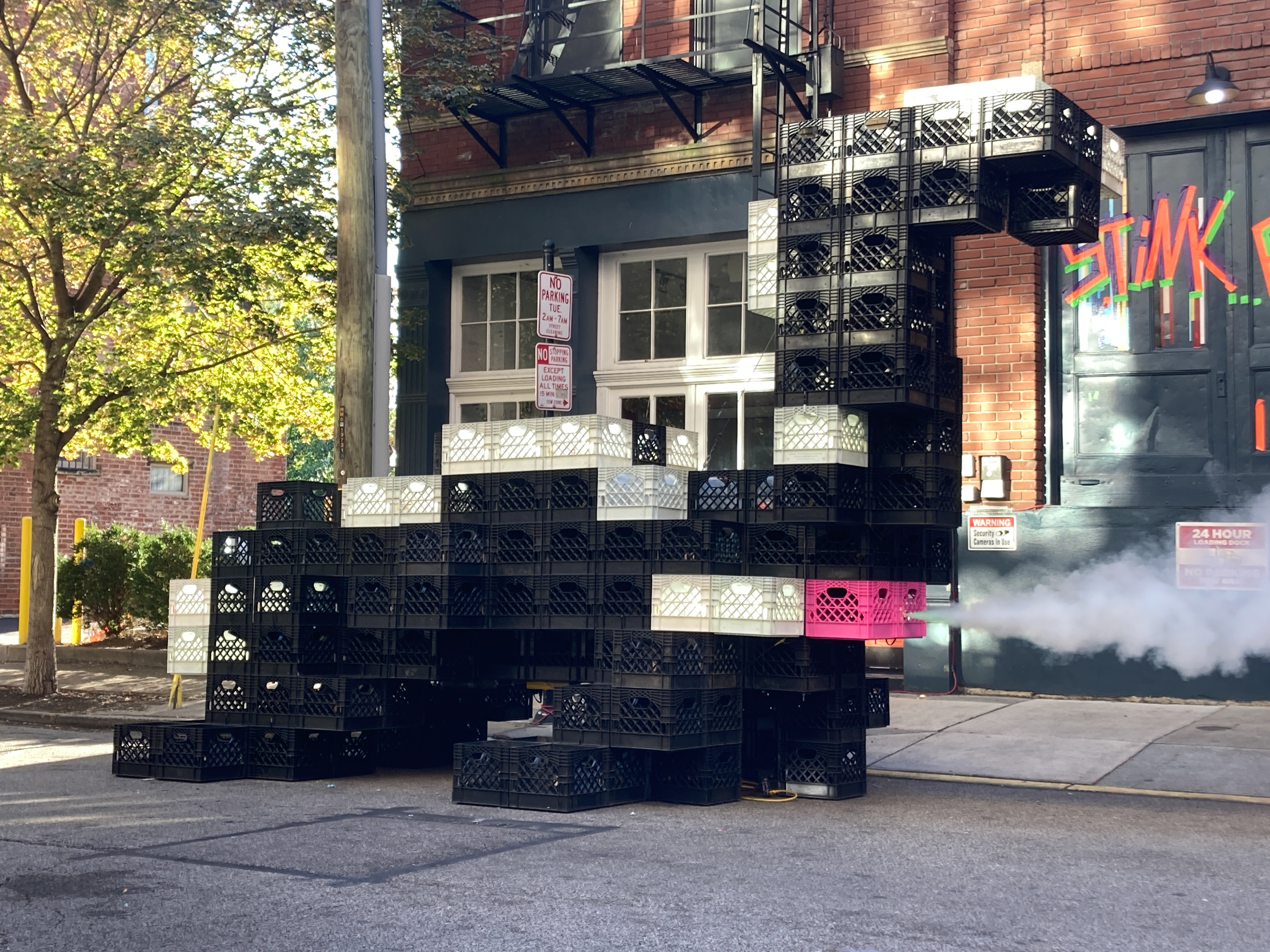 Skunkadelic is a larger-than-life sculpture using ordinary milk crates embedded with lights and lighting effects. Conceived for Blink 2024 as a salute to the Art Academy’s unofficial mascot. The form was inspired by voxel-based building techniques prevalent in applications ranging from high tech 3D modelling to physical building toys like Lego, and in video games such as Minecraft. Our intention is to elevate this traditional block-building practice into a fantastic sculpture that celebrates the creativity and imagination and reflects on our world's pre-occupation with digital entertainments and a concern for addictive gaming.