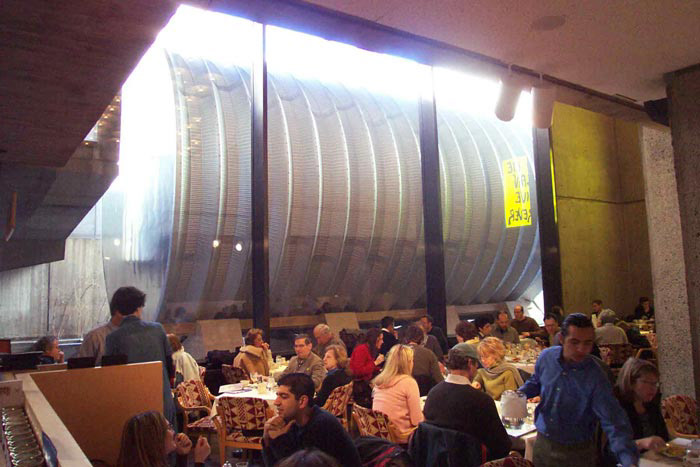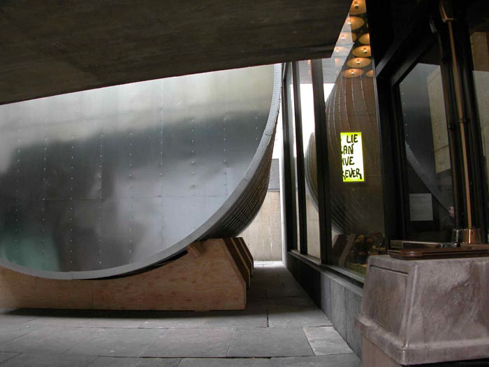 Re-configuring prefabricated Quonset hut parts into a full circle, El Tubo was a large metal vessel on plinths. Akin to a poorly considered bomb shelter, only partially concealed from the Madison Ave. streetscape, it functioned as a hermetic addendum to the museum. The enterable sanctum/cinema, bulging out of the museum’s sunken sculpture garden, projected the subliminal horrors of the suburban nighttime landscape in Deborah Stratman’s film, In Order Not To Be Here. Besides wanting to make the largest work that the Breuer sculpture garden had ever housed, the project gleaned inspiration from the hidden infrastructure of cities (tunnels, pipes, conduits), as well as Frederick Kiesler’s experimental Guild Cinema in lower Manhattan.