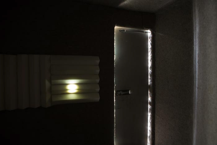 Audio duration is 30 minutes and repeats at the top and bottom of the hour. This installation is designed for one person at a time. Isolation and external sensory deprivation is best achieved with the door closed. Please allow a minimum of 5 minutes for pupil dilation to perceive the dimly lit interior.