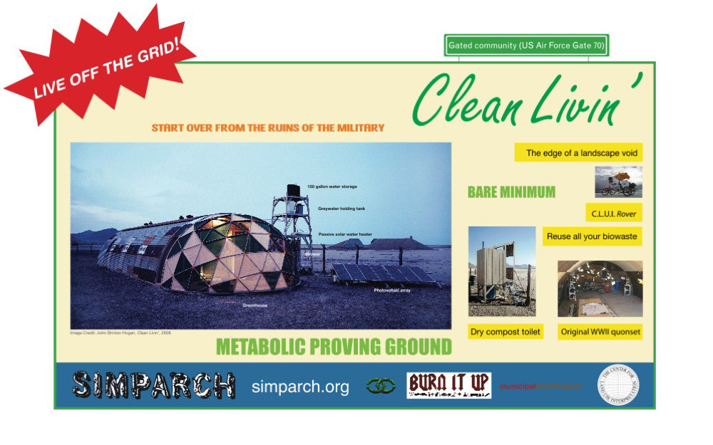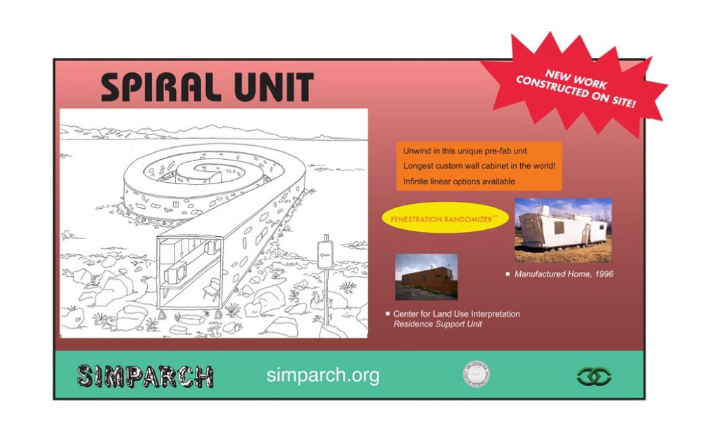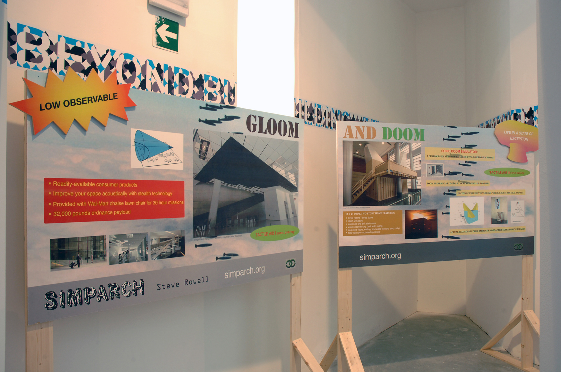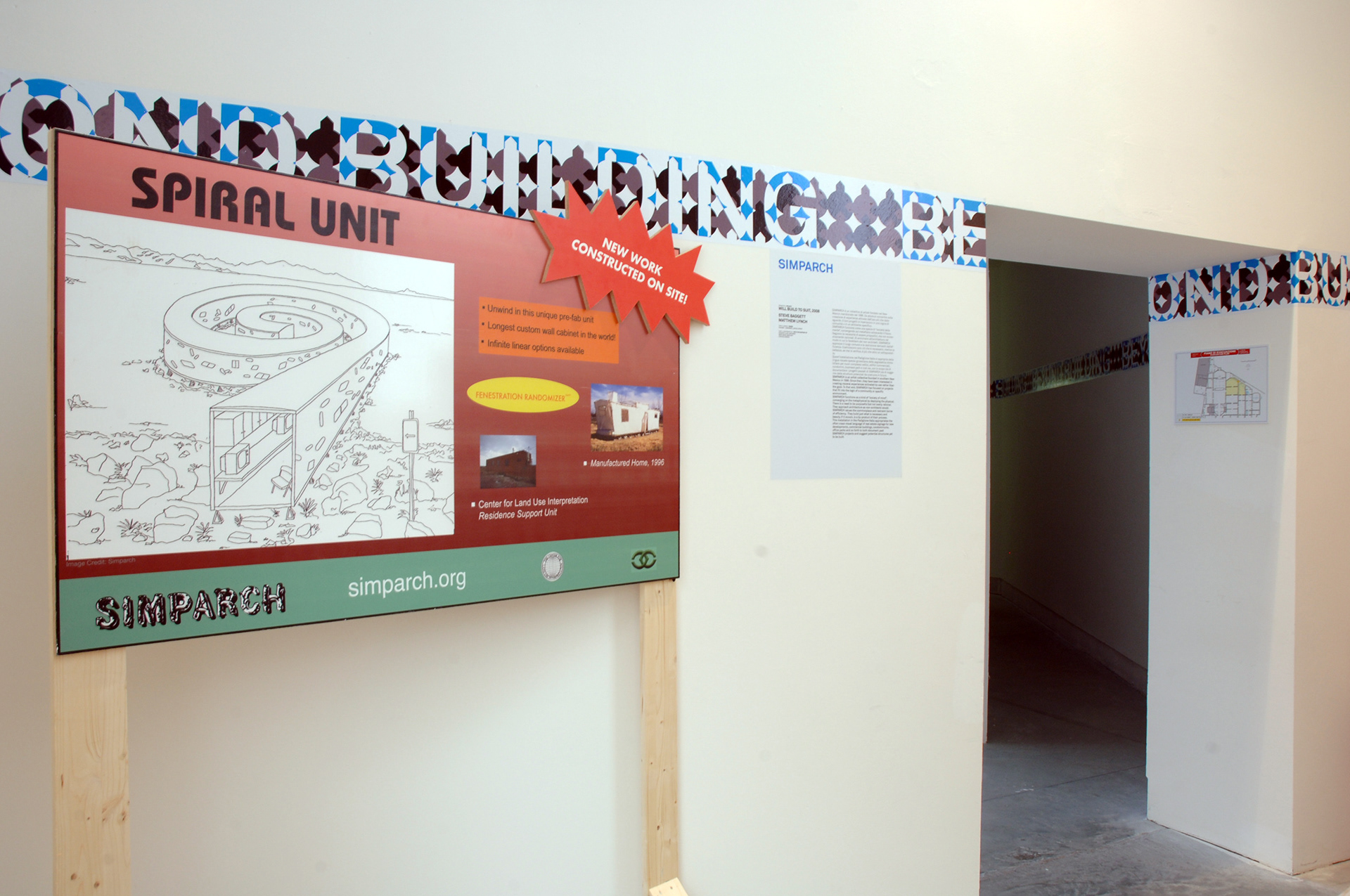 SIMPARCH's contribution to Out There consisted of a series of real estate signage depicting past and future projects. Installed throughout the exhibition, the signs promoted the benefits of SIMPARCH's projects. The claims made by the signs ranged from practical and realistic to far-fetched and satirical